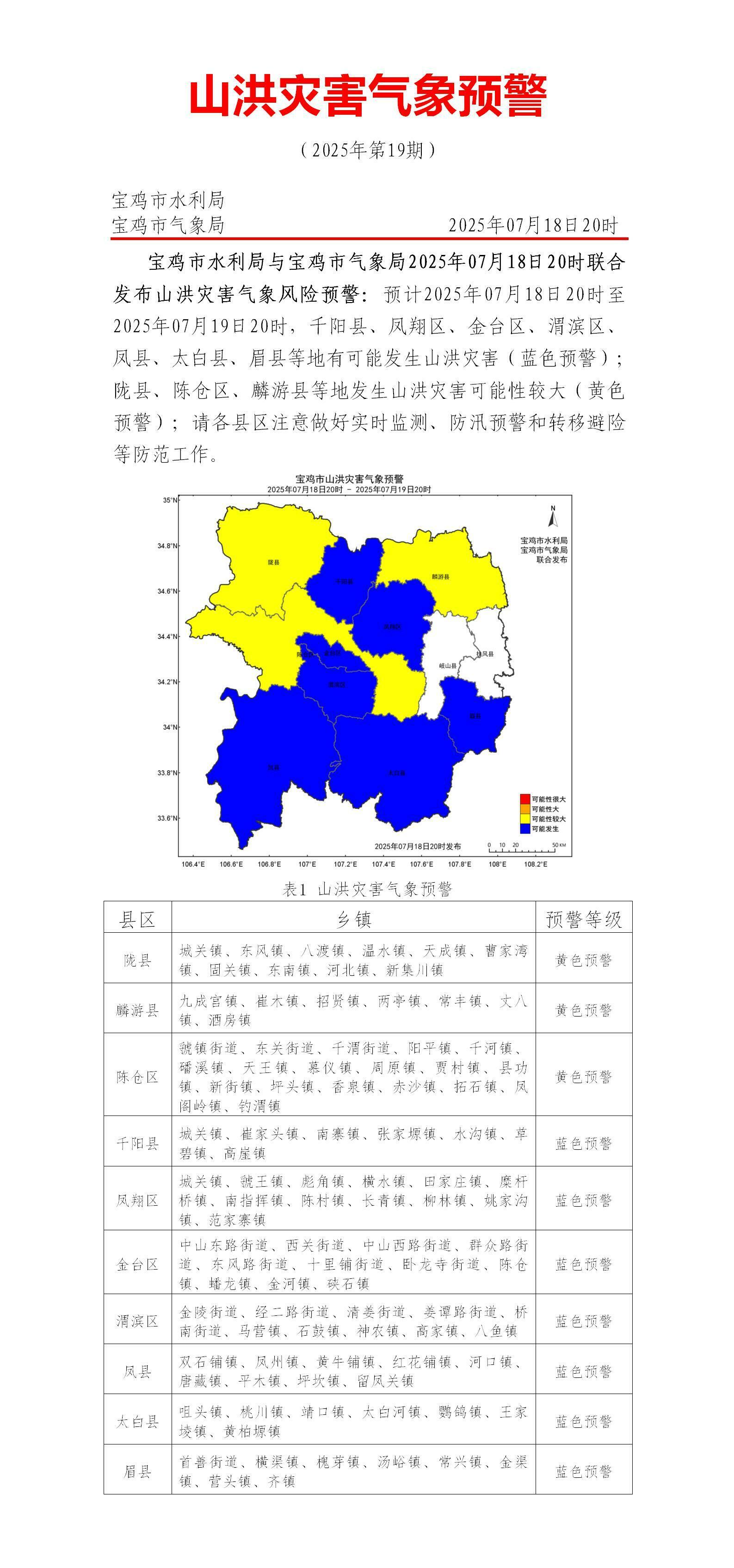 【宝鸡市气象局】澳门威尼斯人官方线上娱乐城与宝鸡市气象局2025年07月18日12时联合发布山洪灾害气象风险预警:预计2025年07月18日20时至2025年07月19日20时,凤翔区、麟游县、千阳县、陈仓区、渭滨区、凤县、金台区等地有可能发生山洪灾害(蓝色预警);陇县发生山洪灾害可能性较大(黄色预警);请各县区注意做好实时监测、防汛预警和转移避险等防范工作。