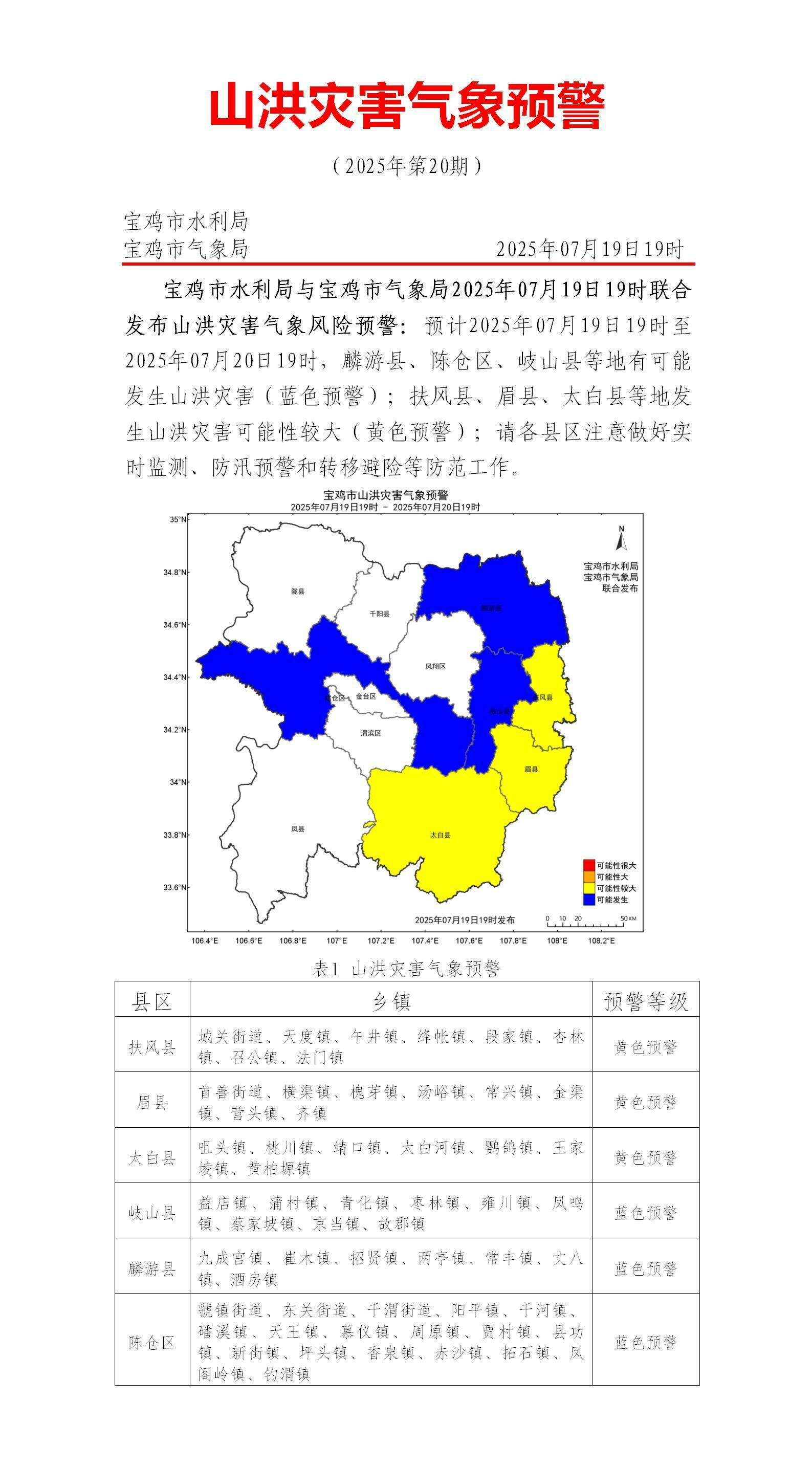 【宝鸡市气象局】澳门威尼斯人官方线上娱乐城与宝鸡市气象局2025年07月19日19时联合发布山洪灾害气象风险预警:预计2025年07月19日19时至2025年07月20日19时,麟游县、陈仓区、岐山县等地有可能发生山洪灾害(蓝色预警);扶风县、眉县、太白县等地发生山洪灾害可能性较大(黄色预警);请各县区注意做好实时监测、防汛预警和转移避险等防范工作。
