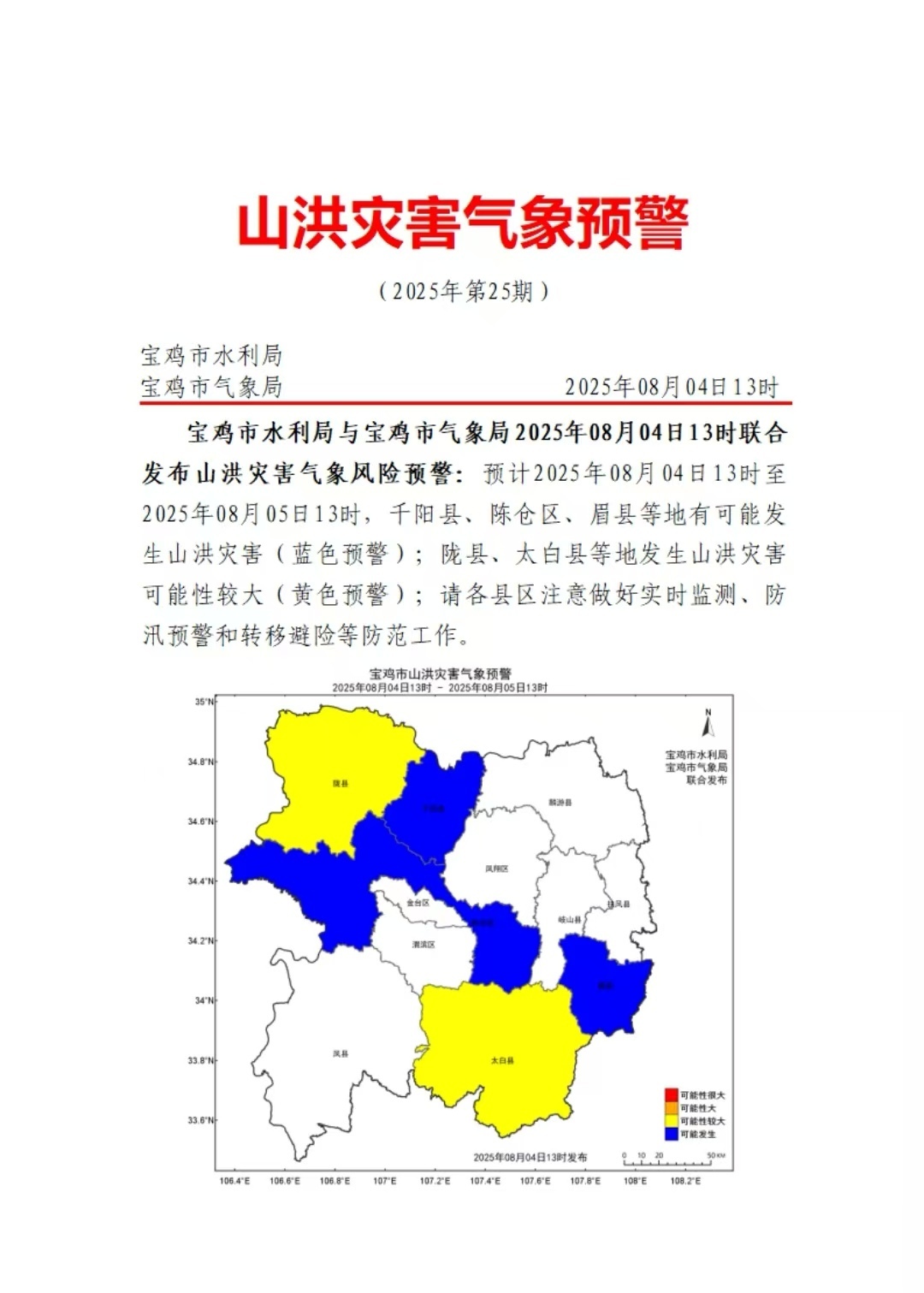 【宝鸡市气象局】澳门威尼斯人官方线上娱乐城与宝鸡市气象局2025年08月04日13时联合发布山洪灾害气象风险预警:预计2025年08月04日13时至2025年08月05日13时,千阳县、陈仓区、眉县等地有可能发生山洪灾害(蓝色预警);陇县、太白县等地发生山洪灾害可能性较大(黄色预警);请各县区注意做好实时监测、防汛预警和转移避险等防范工作。