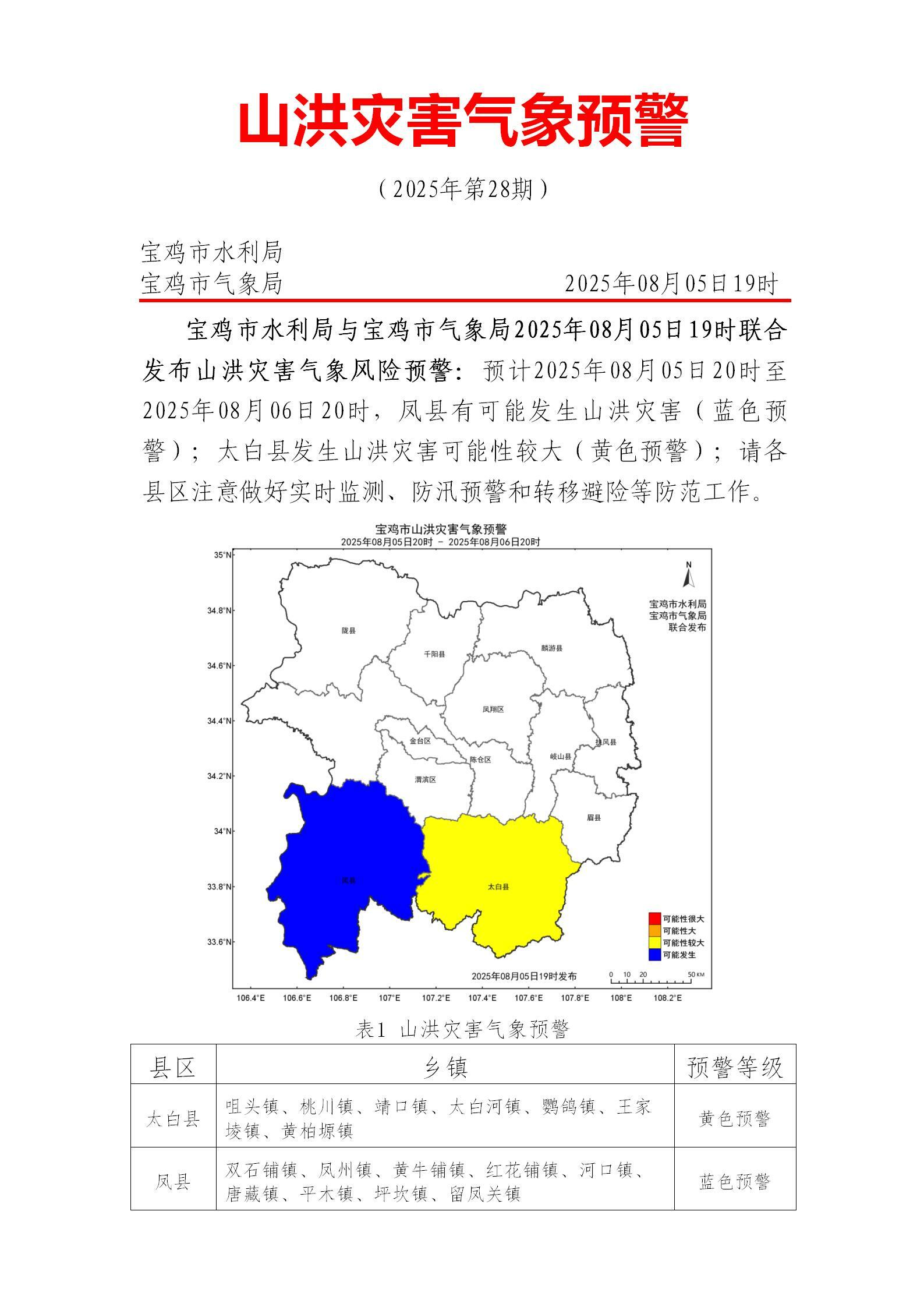 【宝鸡市气象局】澳门威尼斯人官方线上娱乐城与宝鸡市气象局2025年08月05日19时联合发布山洪灾害气象风险预警:预计2025年08月05日20时至2025年08月06日20时,凤县有可能发生山洪灾害(蓝色预警);太白县发生山洪灾害可能性较大(黄色预警);请各县区注意做好实时监测、防汛预警和转移避险等防范工作。