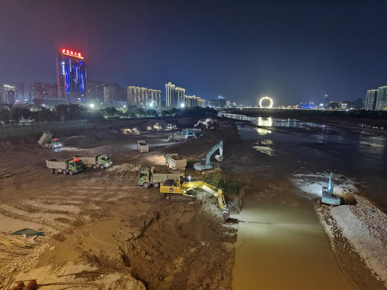 在代家湾橡胶坝清淤疏浚工程施工现场,运输车辆来回穿梭,工程推进繁忙有序,夜晚依旧灯火通明,呈现一派热火朝天的场面。按照设计方案,该项目清淤疏浚量为65.74万m³,每天投入机械车辆50余台,人员130人,经全力抢赶工期,截至26日上午,已完成清淤疏浚量约60万m³。水投集团主要负责同志表示,代家湾橡胶坝清淤疏浚工程工期紧、任务重,要全面落实局党组指示精神,国庆节前全面完工,在该段河道形成更为宏伟,更为广阔、壮观的生态水面效果,全体人员必须不辱使命,提升大局观,跑出“加速度”,通过在工程现场“苦干实干快干,努力干一起干”,彻底转变工作作风,锤炼一支关键时刻“靠得住、顶得上、战得胜”的企业团队,充分彰显水利担当,以实干佳绩迎接党的二十大胜利召开。
